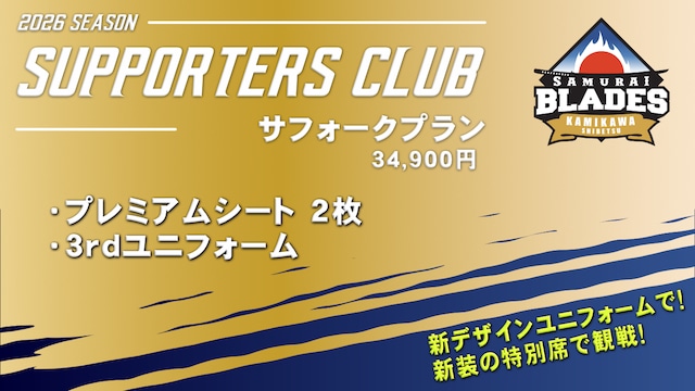 【特典内容】 ・シーズンシート券 1枚 ・2026シーズンサードユニフォーム 1枚 (お好みの背ネーム・背番号をお選びいただけます。) ・2026シーズンブレイズTシャツ 1枚 ・お気に入りの背番号入りの帽子 1つ ・プレミアムシート券 6枚 *商品発注のために必要な情報が多いので、お申込みいただいたのち、メールにて必要事項確認のフォームを送付いたします。